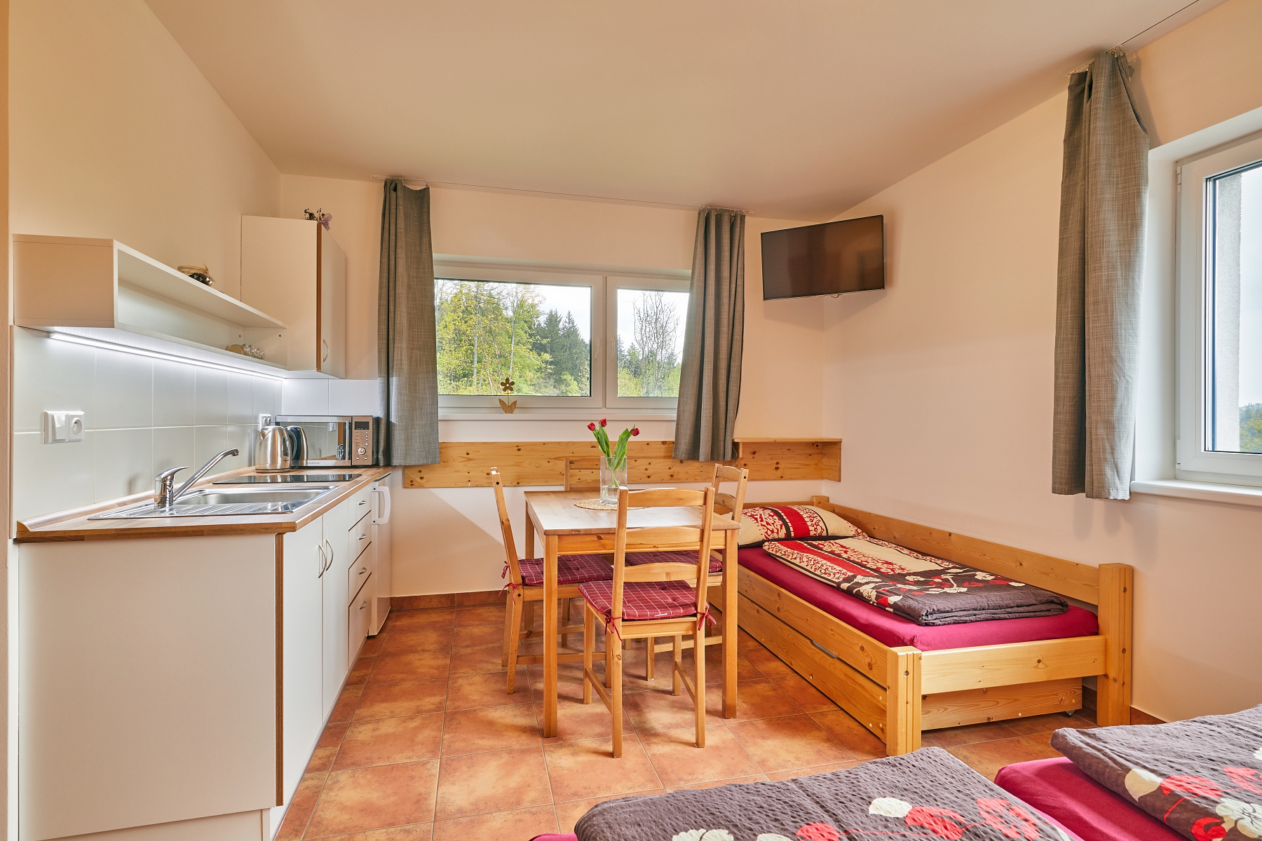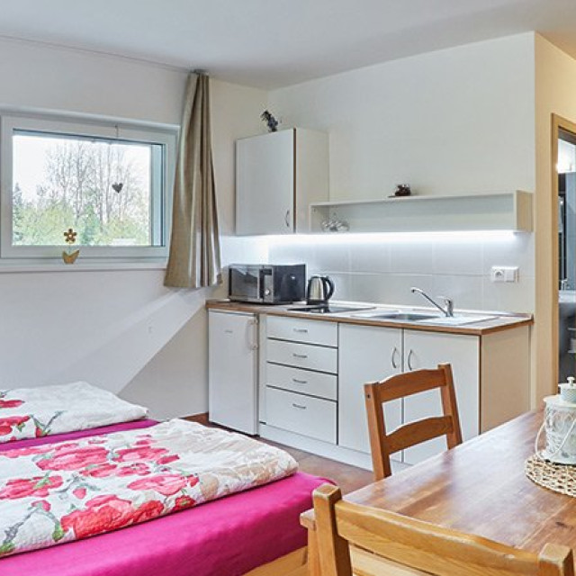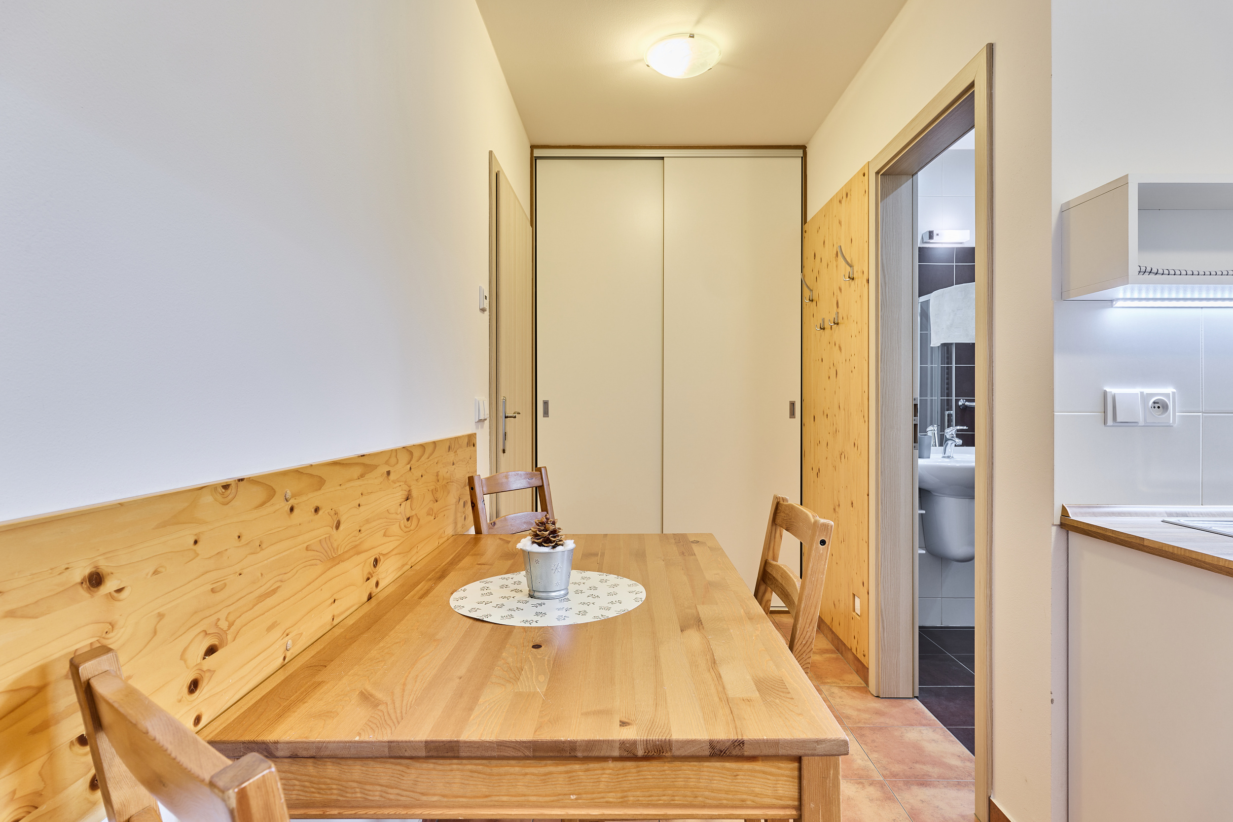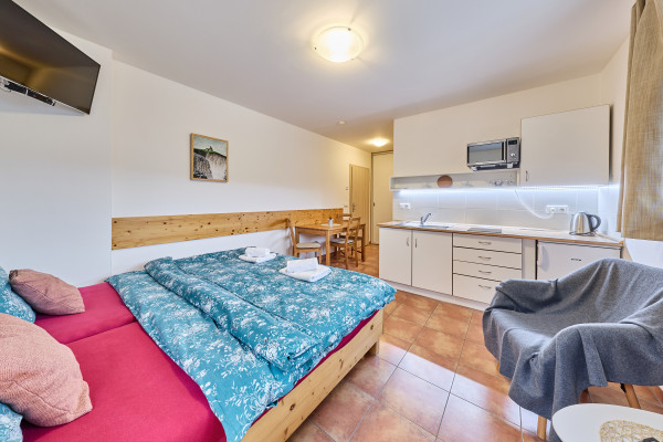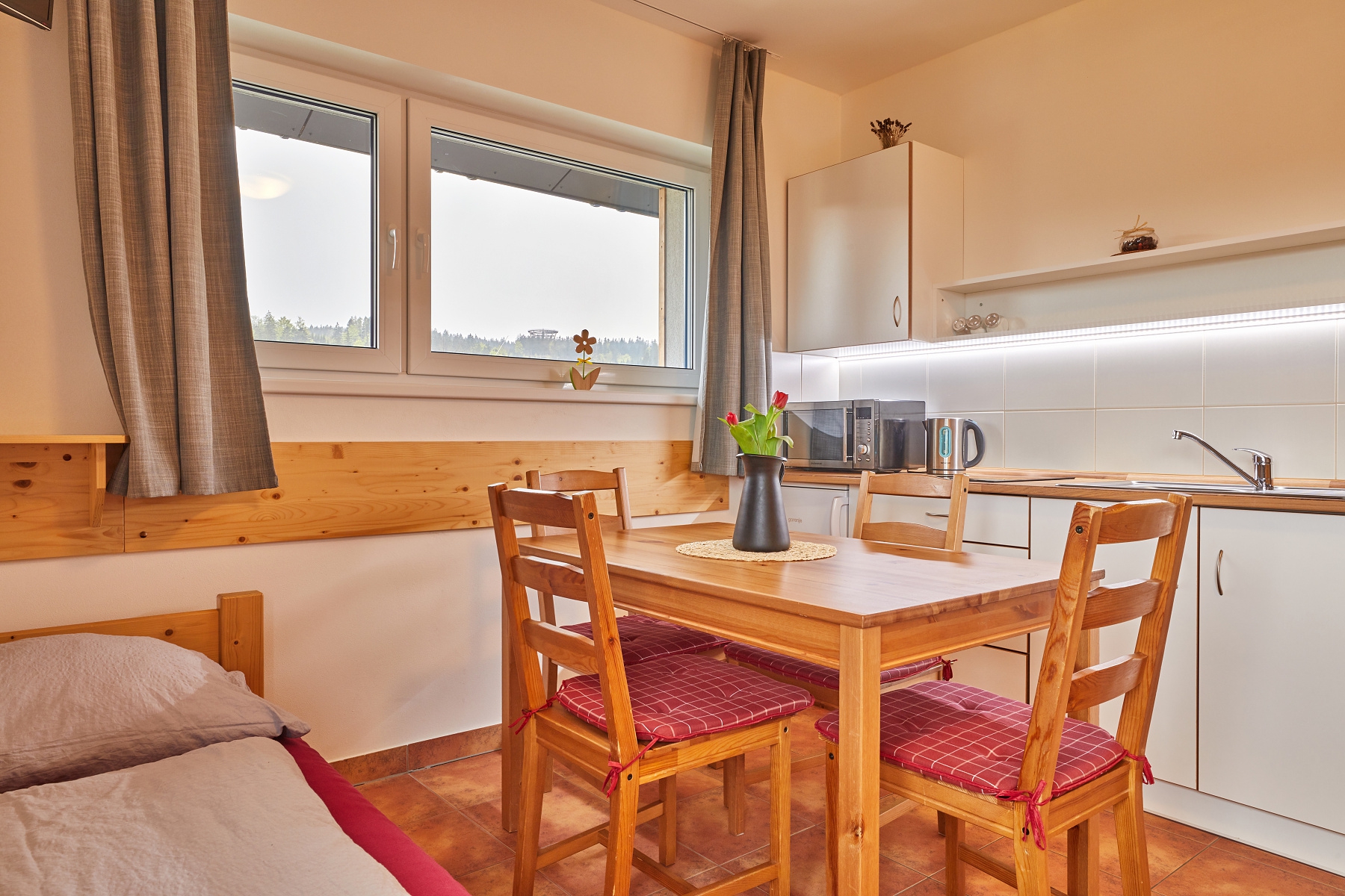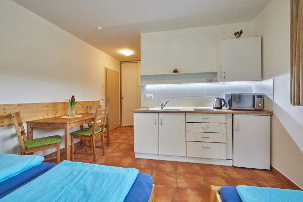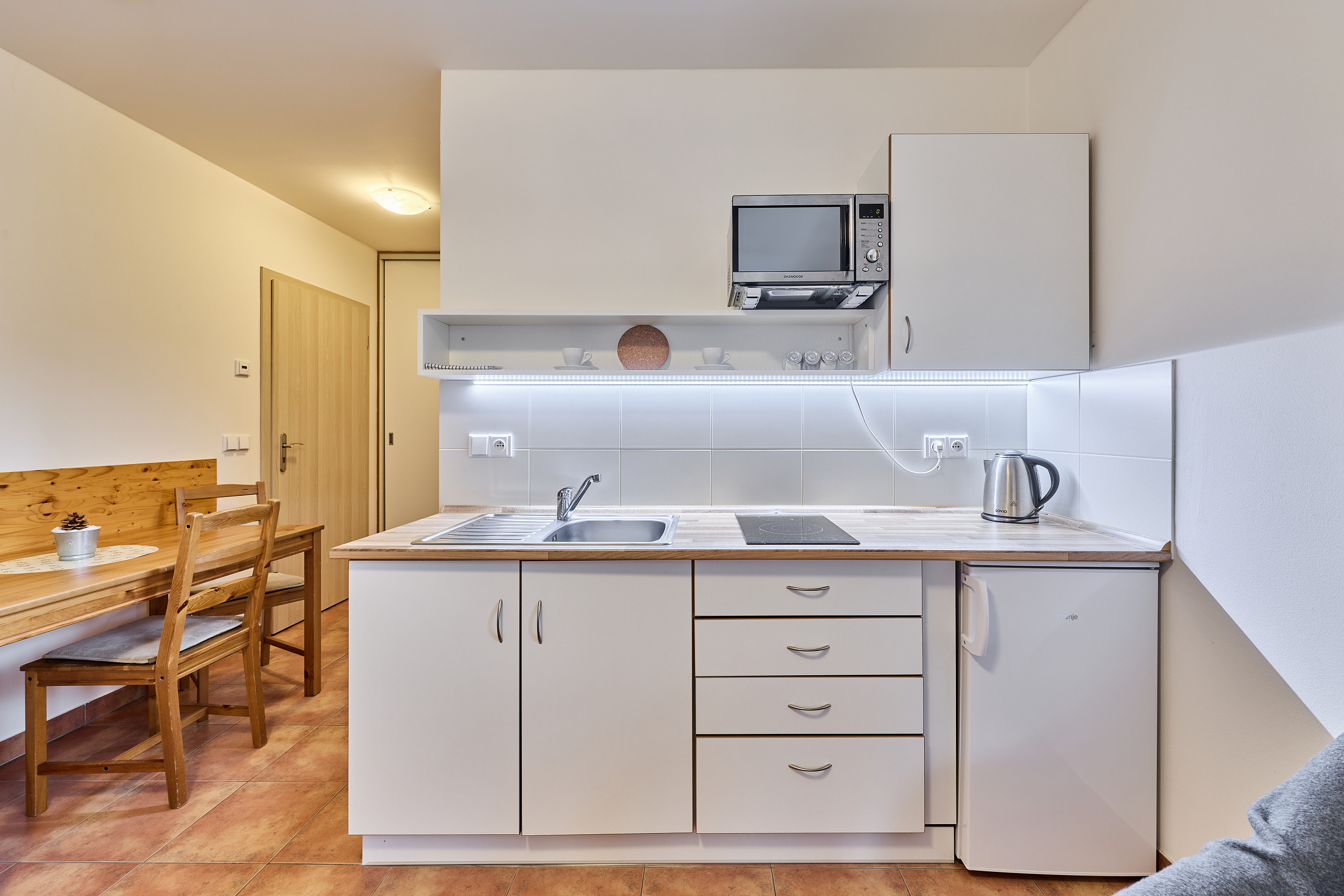 - Kuchyňský kout: Plně vybavený pro přípravu jídel. Zahrnuje základní sadu nádobí, dvouplotýnkovou vestavěnou keramickou desku, mikrovlnnou troubu, rychlovarnou konvici a ledničku.