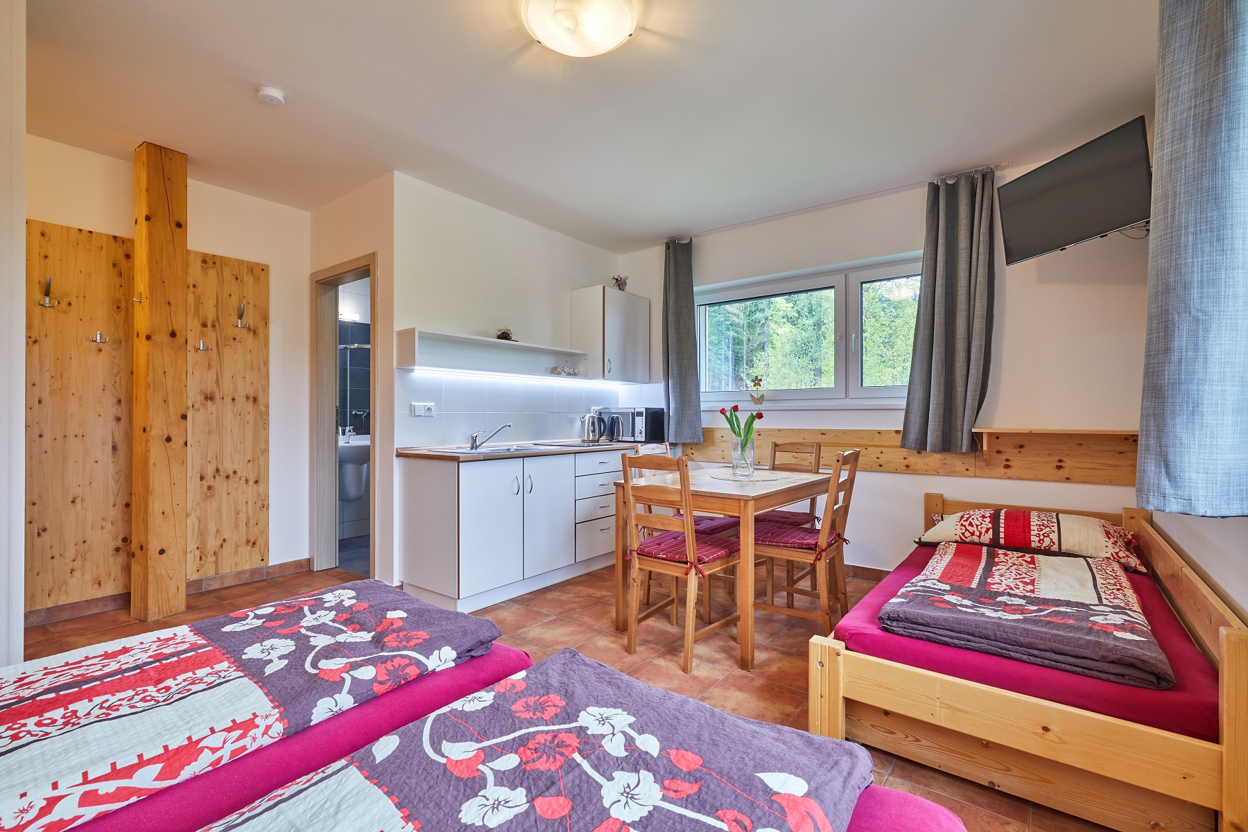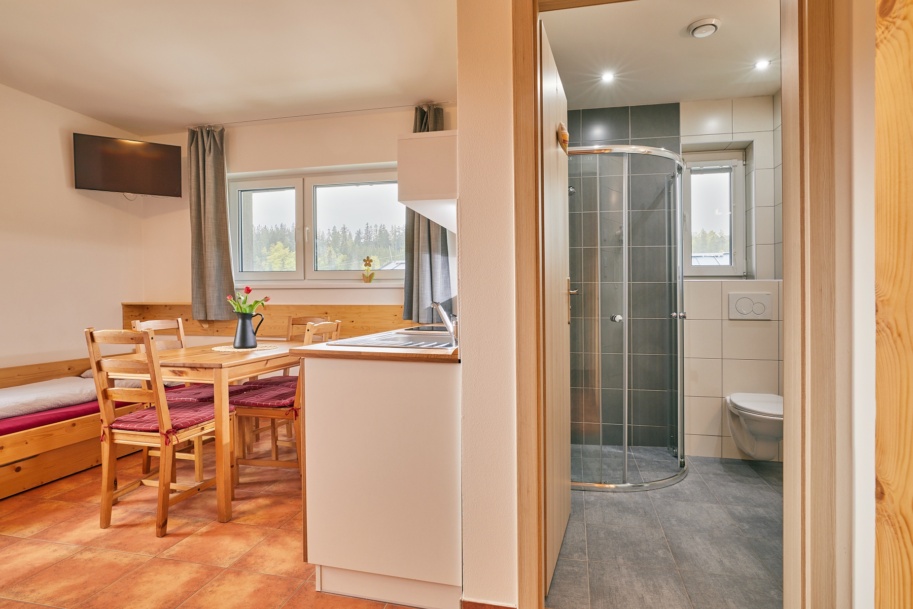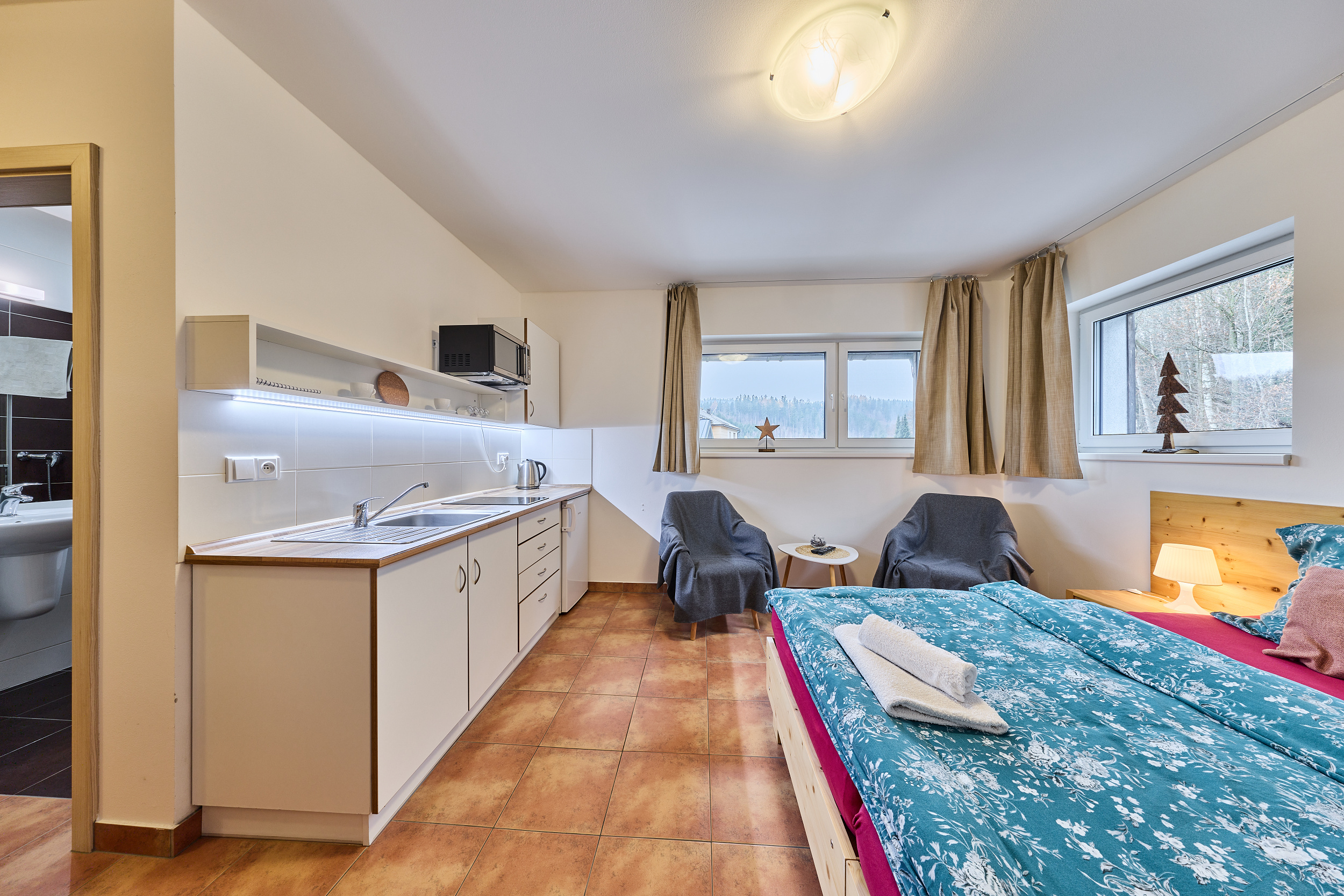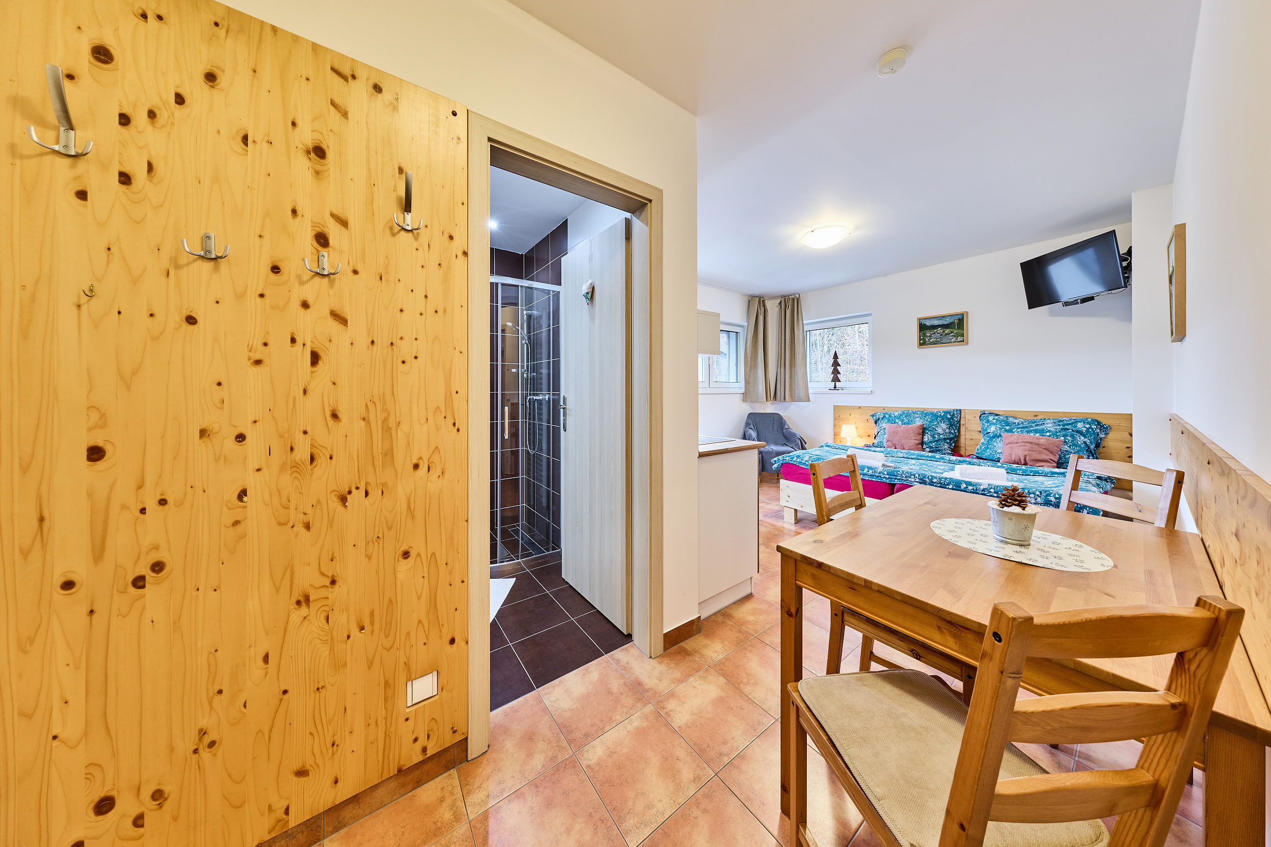- Kuchyňský kout: Plně vybavený pro přípravu jídel. Zahrnuje základní sadu nádobí, dvouplotýnkovou vestavěnou keramickou desku, mikrovlnnou troubu, rychlovarnou konvici a ledničku.